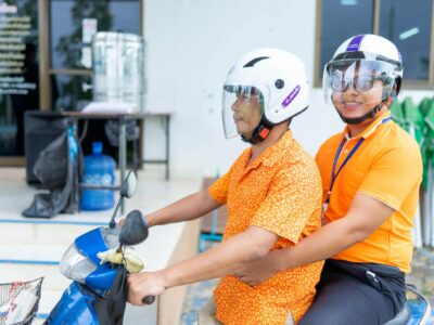 นายธนาธิป อุต๊ะมา นายกองค์การบริหารส่วนตำบลเวียงแก้วมอบหมวกนิรภัย หน้าสำนักงานองค์การบริหารส่วนตำบลเวียงแก้วและร่วมถ่ายรูปรณรงค์ถนนปลอดภัย